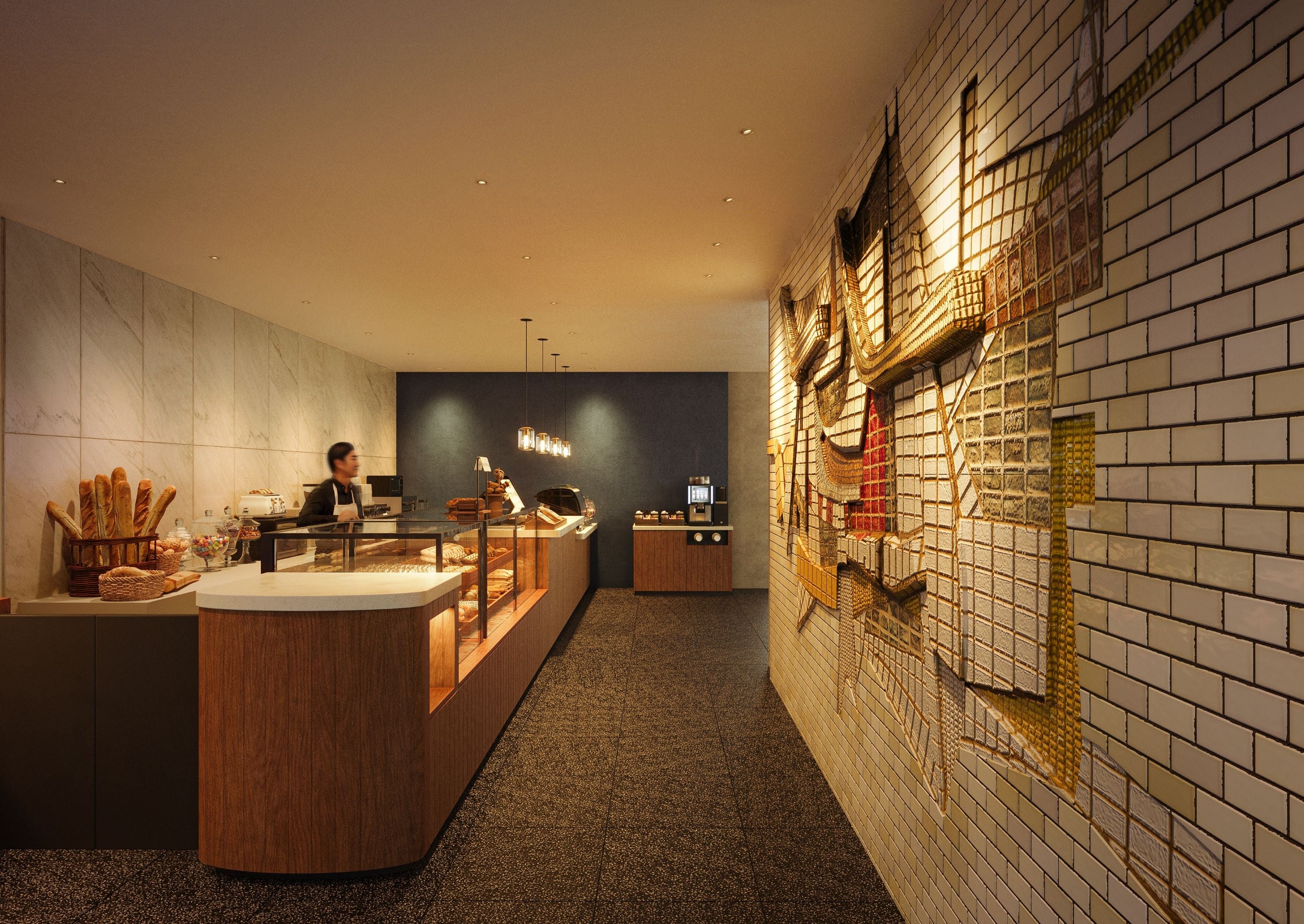 「OMOベーカリー」の壁面には、村野藤吾氏と交流のあった彫刻家・辻晉堂氏による泰山タイルレリーフ「海・波・船」を原位置保存します。この泰山タイルレリーフは、かつて旧市長室・旧市長応接室エントランスを彩り、横浜市民にとって馴染み深い作品です。タイルの重なりが生み出す見ごたえのある美しい作品のある空間で、こだわりの焼き立てパンを楽しむことができます。