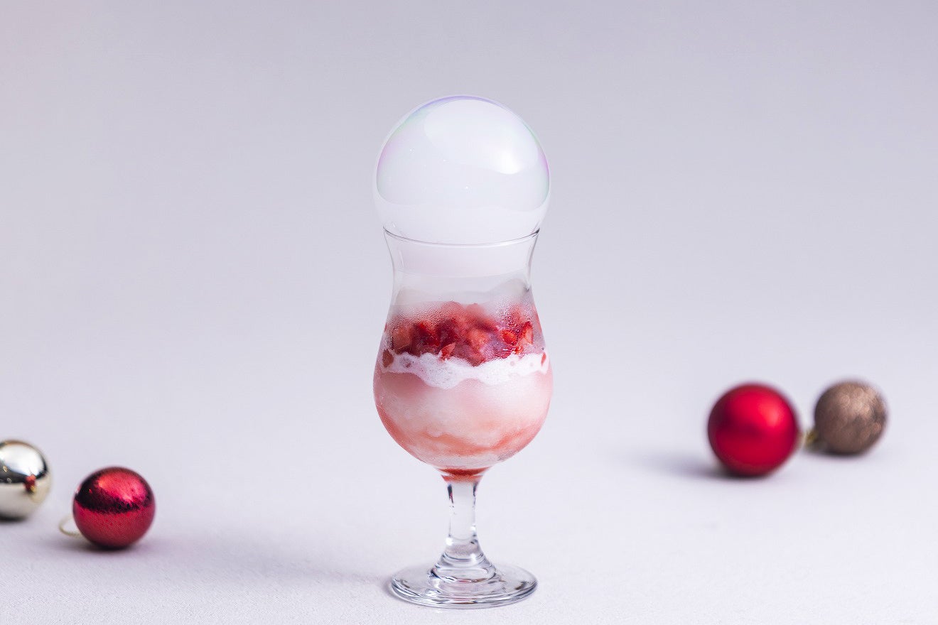 ウォッカをベースに、宮崎発祥の人気ドリンク『ヨーグルッペ』とミルク、はちみつを合わせ、グレナデン・シロップとストロベリーダイスでほんのりピンクに染め上げました。グラスの上の白いバブルが弾けるとともにスモークがふわりと広がり、まるでスノードームを揺らしたような幻想的な光景が目の前に広がります。