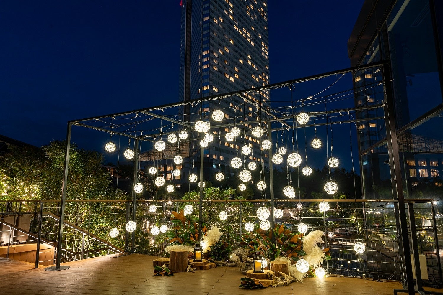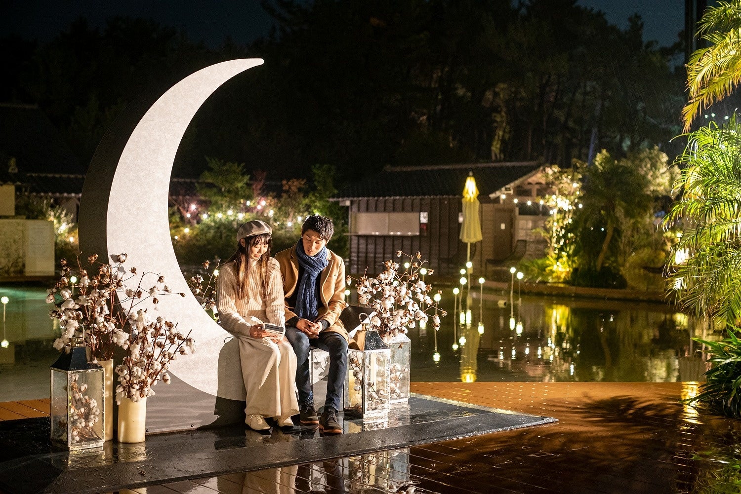 ホテルに隣接する宿泊者専用のガーデンエリア「THE LIVING GARDEN」に、夜空の星が舞い降ります。たくさんのあかりに照らされた水辺は、まるで星降るガーデンのよう。プールサイドには巨大スノードームや三日月型のオブジェが輝き、焚火のリビングにはあたたかな光に包まれた幻想的なフォトスポットが今年も登場します。