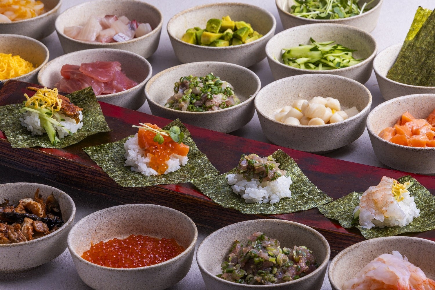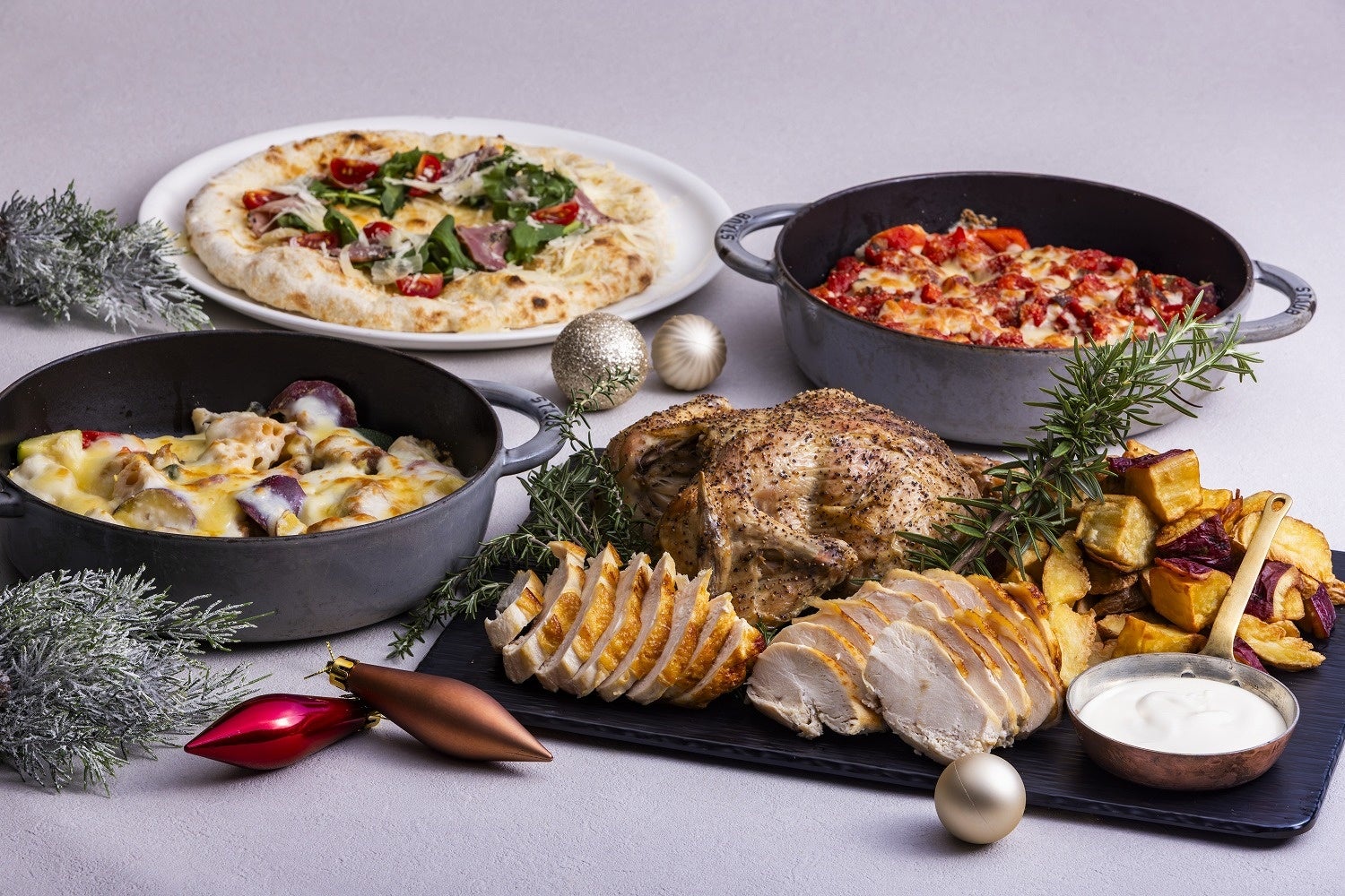 ホリデーシーズンならではのローストチキンや鶏肉のクリーム煮込み、クリスマスリースをイメージしたピッツァ、10種類以上の具材を組み合わせて愉しむ手巻き寿司など、多彩なメニューが登場します。また、宮崎牛のローストビーフをはじめ、チキン南蛮や冷や汁など、人気の定番メニューもお楽しみいただけます。