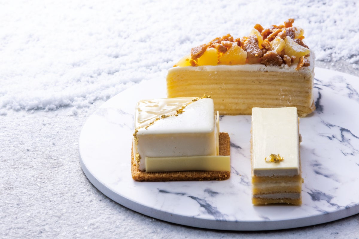 幻想的な冬の世界をイメージしたスイーツやパンをご用意しました。リンゴのミルフィーユやオレンジショコラムースなど、雪のように繊細で上品なスイーツ。宮崎名物のじゃりパンをはじめとする白いパンたち。純白の世界に溶け込むような、優雅なひとときをご堪能ください。