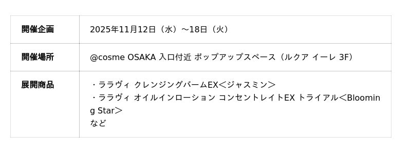 オイルイン美容を提唱するスキンケアブランド『ララヴィ』(株式会社アンズコーポレーション 本社:大阪市中央区 代表取締役社長:山田昌良)は、2025年11月12日(水)から18日(火)まで@cosme OSAKA入口付近ポップアップスペースにて、体験型スキンケア POP-UP EVENT『Jasmine Winter Retreat(ジャスミン ウィンター リトリート)』を開催いたします。