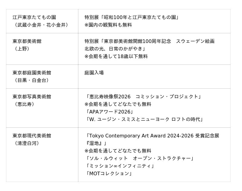 2026年3月1日(日)から 4月5日(日)までの期間、18歳以下の方は下記の展覧会が無料で観覧できます。※年齢を確認できる証明書の提示が必要です。(入場方法等詳細は2月下旬までにウェブサイトでお知らせします。)
