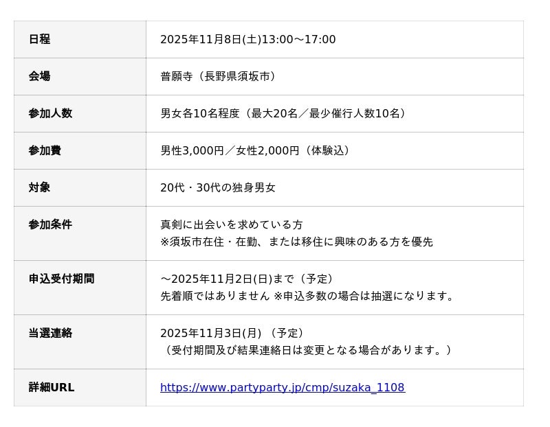 国内最多*¹の成婚数を誇る株式会社IBJ(代表取締役社長:石坂 茂、本社:東京都新宿区、東証プライム:6071)が運営する婚活パーティーサービス「IBJ Matching」は、長野県須坂市と連携し、2025年11月8日(土)に、長野県須坂市の歴史ある寺院「普願寺」にて、長野県須坂市主催の自治体コラボイベント『和菓子作り体験恋活 in 普願寺』を開催いたします。