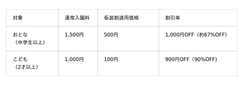 仮装をしてご来園されたご本人様のみ(チケット売場にてご確認いたします)