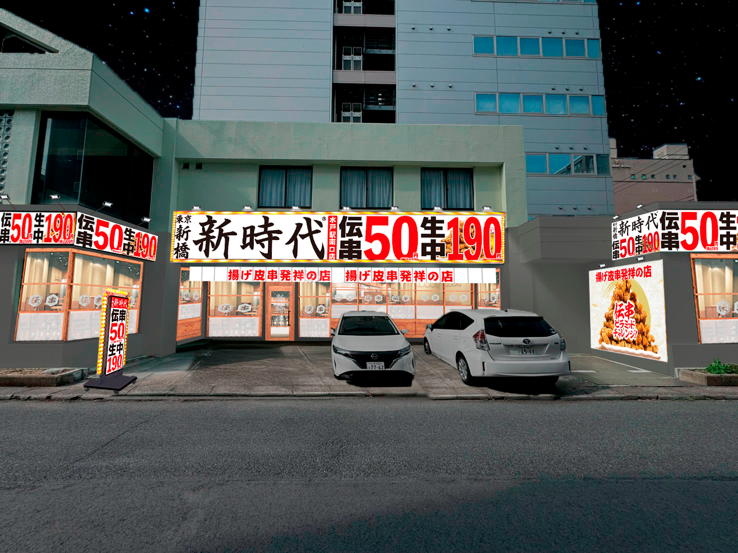 新時代は「揚げ皮串発祥」のお店であり、名物の『伝串』は、特許庁から認められる唯一無二の大ヒット商品です。並んででも「伝串」を体験されたいというお客様が多く、連日行列ができる大人気の居酒屋です。1000の街を元気にするため、全国の街を一つずつ元気にしており、今回はついに茨城に初上陸。茨城だけでなく、北関東全体を元気にします。オープン前から大行列ができること間違いなしです。