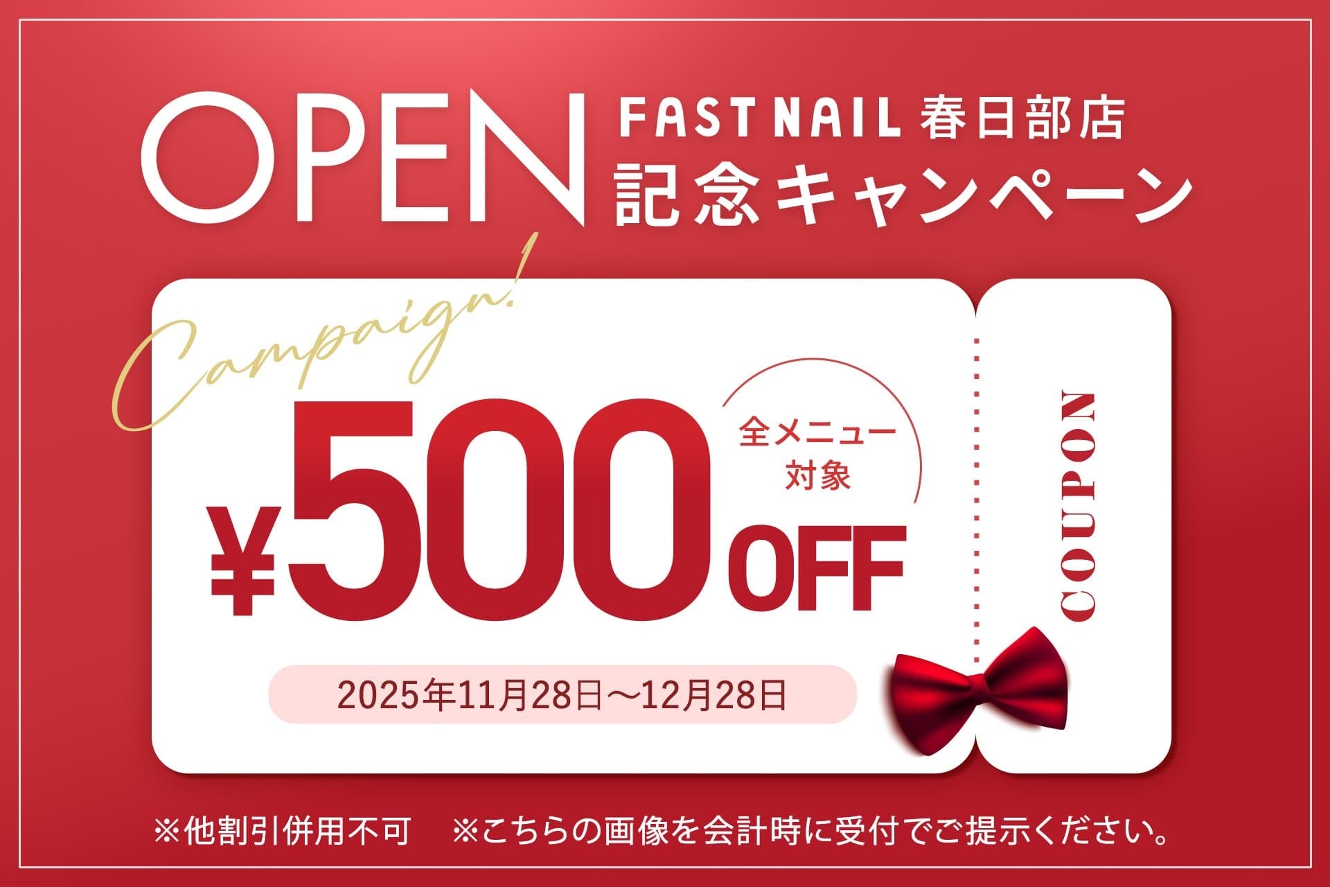 オープンを記念して、「FASTNAIL 春日部店」限定で、全メニュー500円OFFキャンペーンを実施いたします。