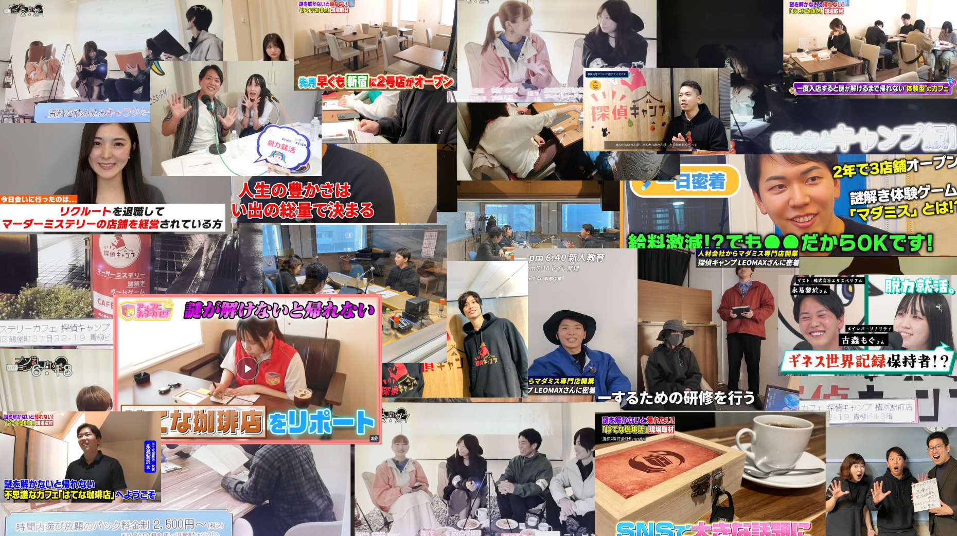 探偵キャンプは、若者を中心に大人気の体験型ミステリーゲーム「マーダーミステリー(マダミス)」を誰でも気軽に楽しめる、カジュアルなカフェです。オシャレで開放的な店内で、リーズナブルにたくさん遊べることが魅力で、マダミス未経験者から上級者まで、幅広い方々が利用しています。初めての方にも、豊富な知識を持つスタッフが丁寧にレクチャーするので、安心して遊べます。銀座、新宿、横浜に3店舗あり、テレビ、ラジオ、雑誌、Youtubeなど、数々のメディアにも取り上げられている人気店となっております。(詳細:東京・横浜のマーダーミステリー専門店 探偵キャンプ )