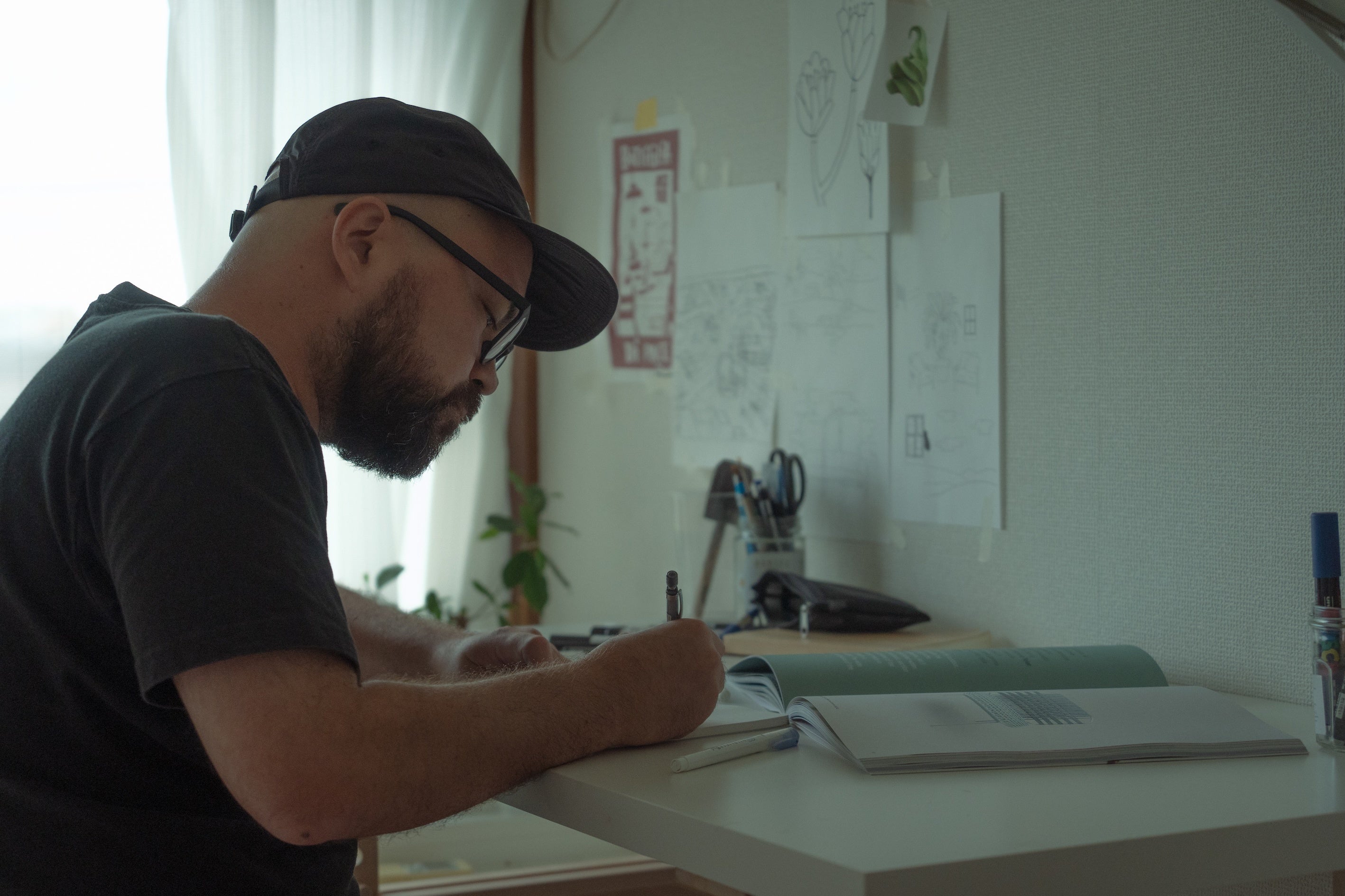 アーティストのHugo Yoshikawa、東京のアトリエにて