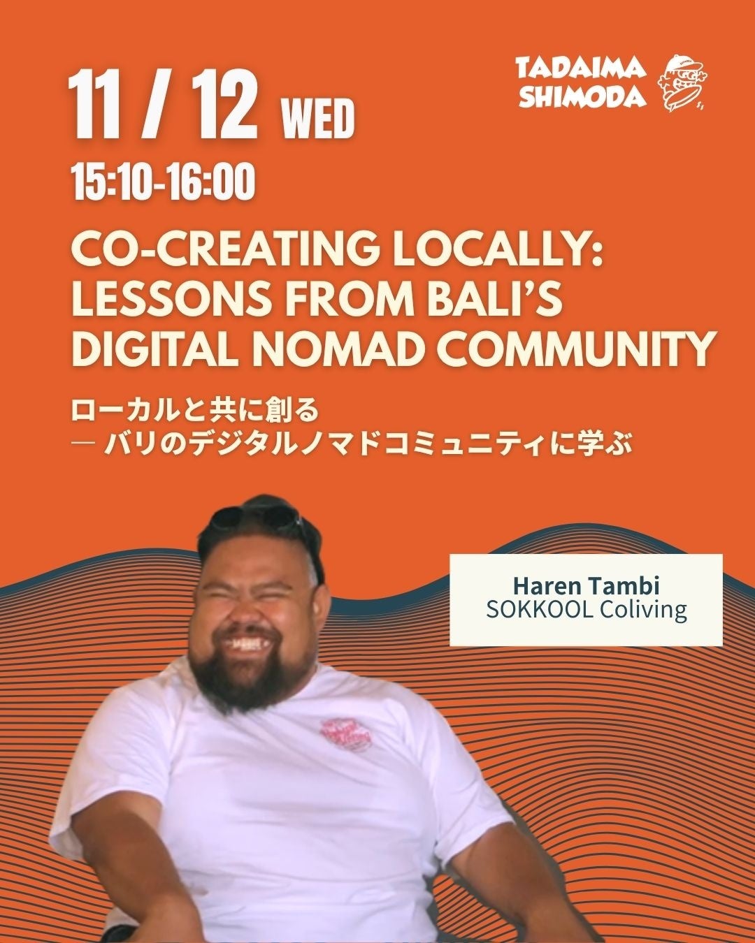 ローカルと共に創る ― バリのデジタルノマドコミュニティに学ぶインドネシア・バリ島在住。バリを「デジタルノマドの聖地」へと成長させたコワーキング施設「Dojo Bali」の人気コミュニティマネージャーを務め、現在は「SOKKOOL Coliving」のチーフハピネスマネージャーとして活動。毎月300~400名以上のノマドを受け入れ、日本各地のノマドプログラムにもコミュニティマネージャーとして参画。2024年11月に「TADAIMA SHIMODA」にて下田に来訪。