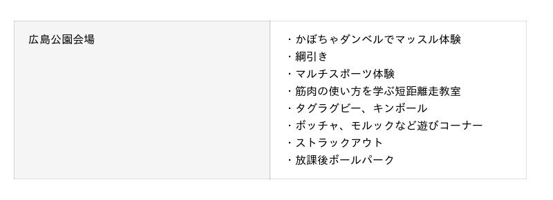 広島公園では、かぼちゃを使ったダンベル、足が早くなる走り方講座、マルチスポーツ、綱引きなどユニークな屋外スポーツエリアが登場。