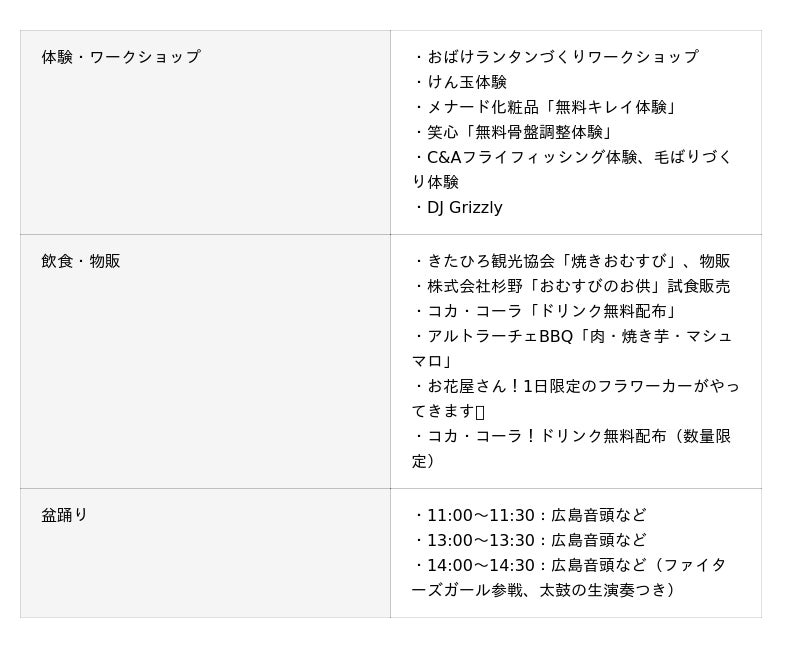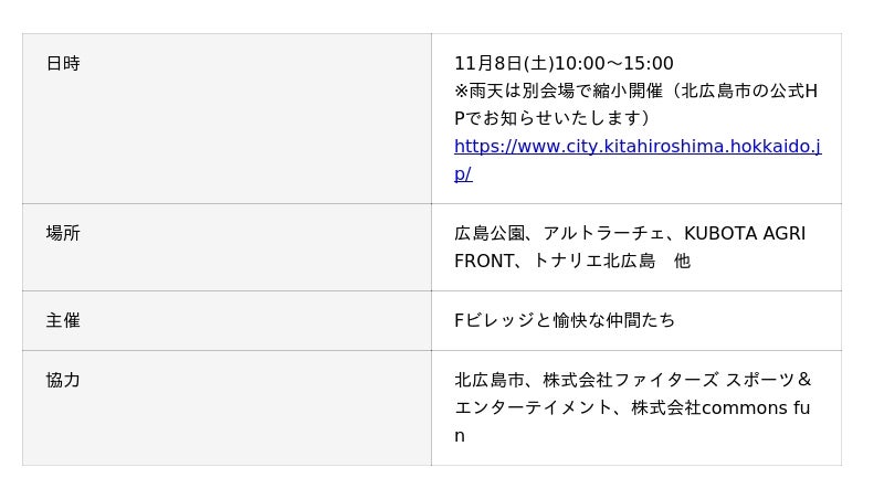 ※雨天時は会場を変えて縮小開催いたします(天候によるプログラム変更等は北広島市の公式サイトでお知らせいたします)