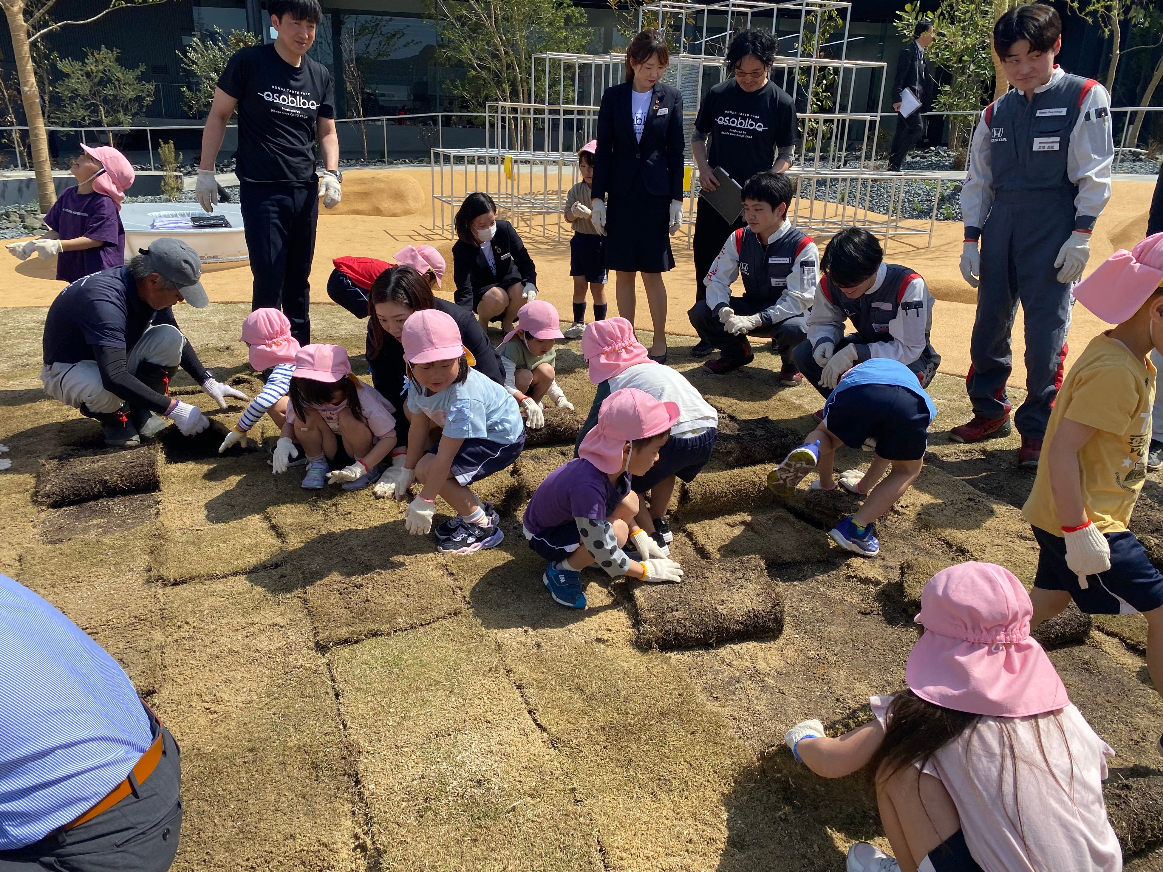 リニューアルオープンに向けて武雄市の幼稚園児が芝張り体験、未来を担う子どもたちと新たな公園との出会いの瞬間でした。にぎやかに、土にまみれながら真剣に上手に芝張りを楽しんでくれました。