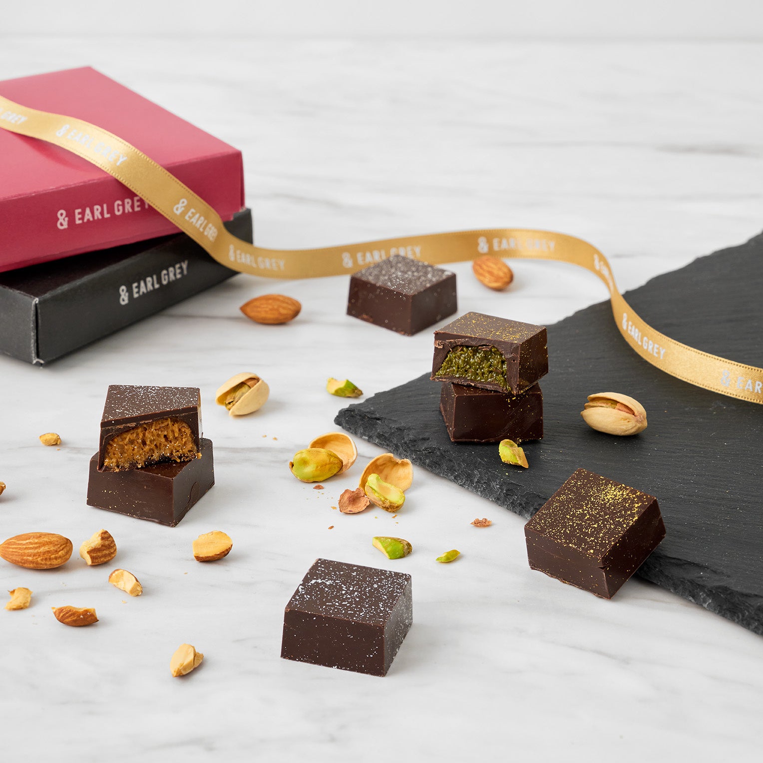 柔らかな甘みとコク、さらにほのかな苦みのバランスが絶妙のアーモンドとザクザクとザクザク食感を楽しめる、& EARL GREY オリジナルドバイチョコ。