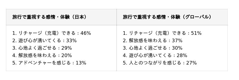 日本の旅行者は、グローバル平均と同様に「リチャージ(充電)」を旅の目的として最も重視していますが、「楽しさ」を求める割合が他国よりも高いという特徴があります。一方、世界的には、「リラックス」や「人混みを避ける」といった静かで自分を取り戻すウェルネス旅行が人気を集めており、日本とは異なるトレンドが見られました。