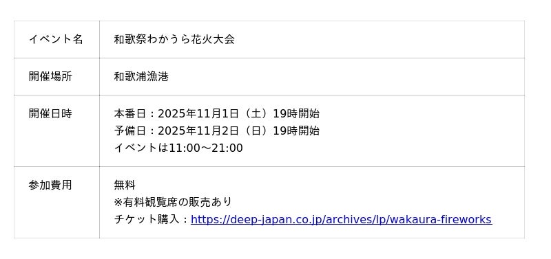 本イベントは、和歌山市を代表する秋の一大イベントとして開催され、花火とドローンが織りなす光の共演が、和歌浦湾の夜空を鮮やかに彩ります。