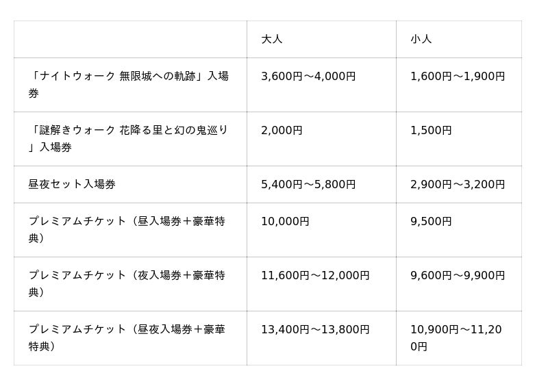 ※「ナイトウォーク 無限城への軌跡」については4歳以下無料。「謎解きウォーク 花降る里と幻の鬼巡り」に参加するには購入が必要となります