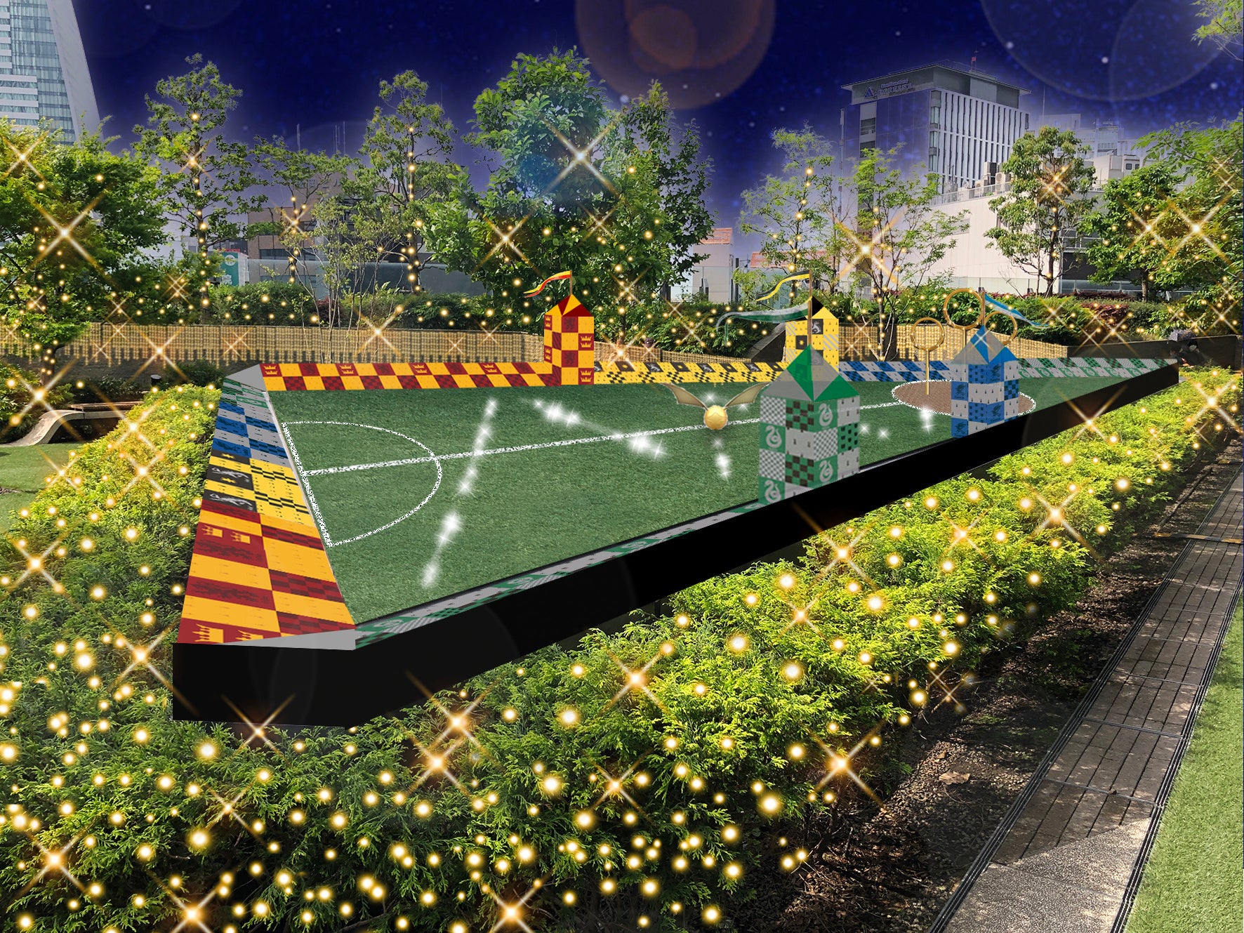 魔法界の人気スポーツ、クィディッチの競技場をイメージし、4つの寮をモチーフに、フィールドではLEDライトで金のスニッチを表現。