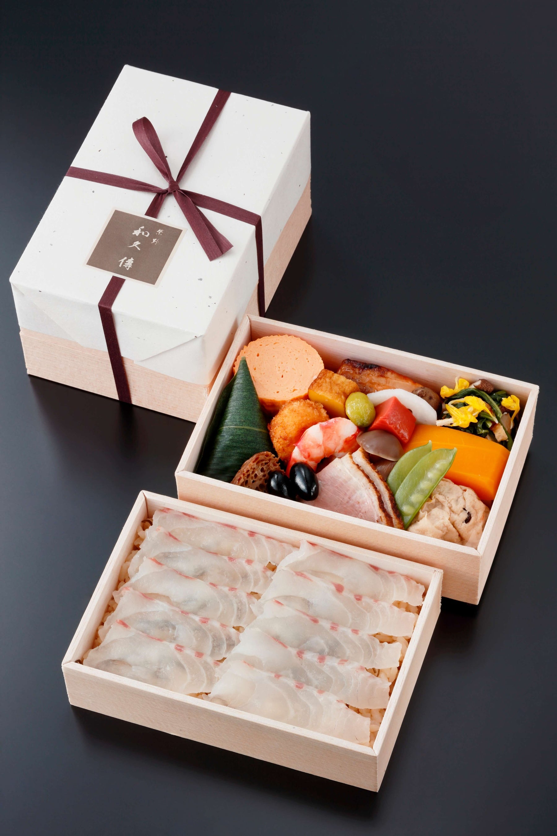 鯛の薄造りを敷き詰めた特製ちらしに、料亭の味を揃えた二段重ねのお弁当。一折で和久傳の多彩な味わいをお楽しみいただけます。秋限定の献立には、揚げ銀杏や粟麩、炊きものに添えた菊花などで今だけの味覚を盛り込みました。