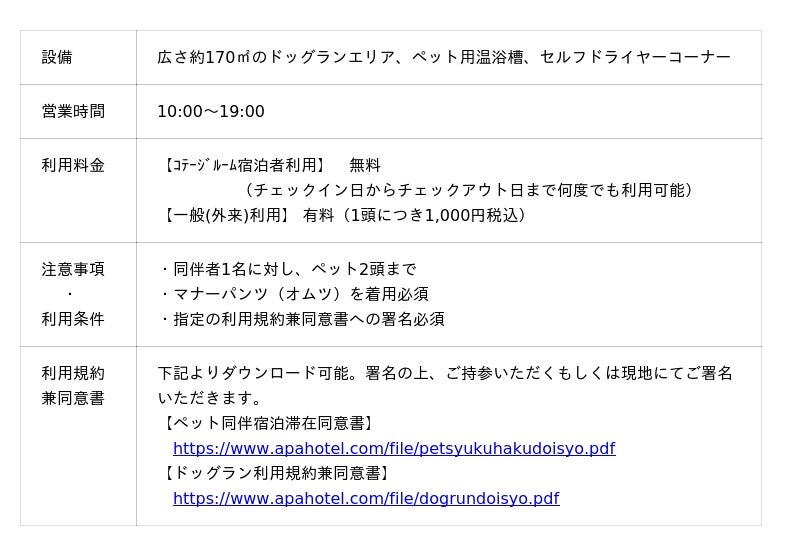 アパホテル〈高松空港〉は、高松空港から車で約3分※に位置し、館内にはサウナ付きの天然温泉展望大浴殿「さぬきの湯」や湯上がりレストルーム、会議室、ミニコンビニを完備。標準的なシングル、ダブル、ツインに加え、トリプル、フォース、最大5名様まで利用可能な和洋室など多様な客室タイプを用意しており、ビジネス、観光、イベント、インバウンド(訪日外国人)など幅広く利用されている。近年、旅行市場においてペットツーリズムへの関心が高まる中、アパホテルとしても新たな宿泊需要を創出するため、愛犬と一緒に泊まれるコンテナ型客室「コテージルーム」と全天候型の屋内ドッグランを新設した。