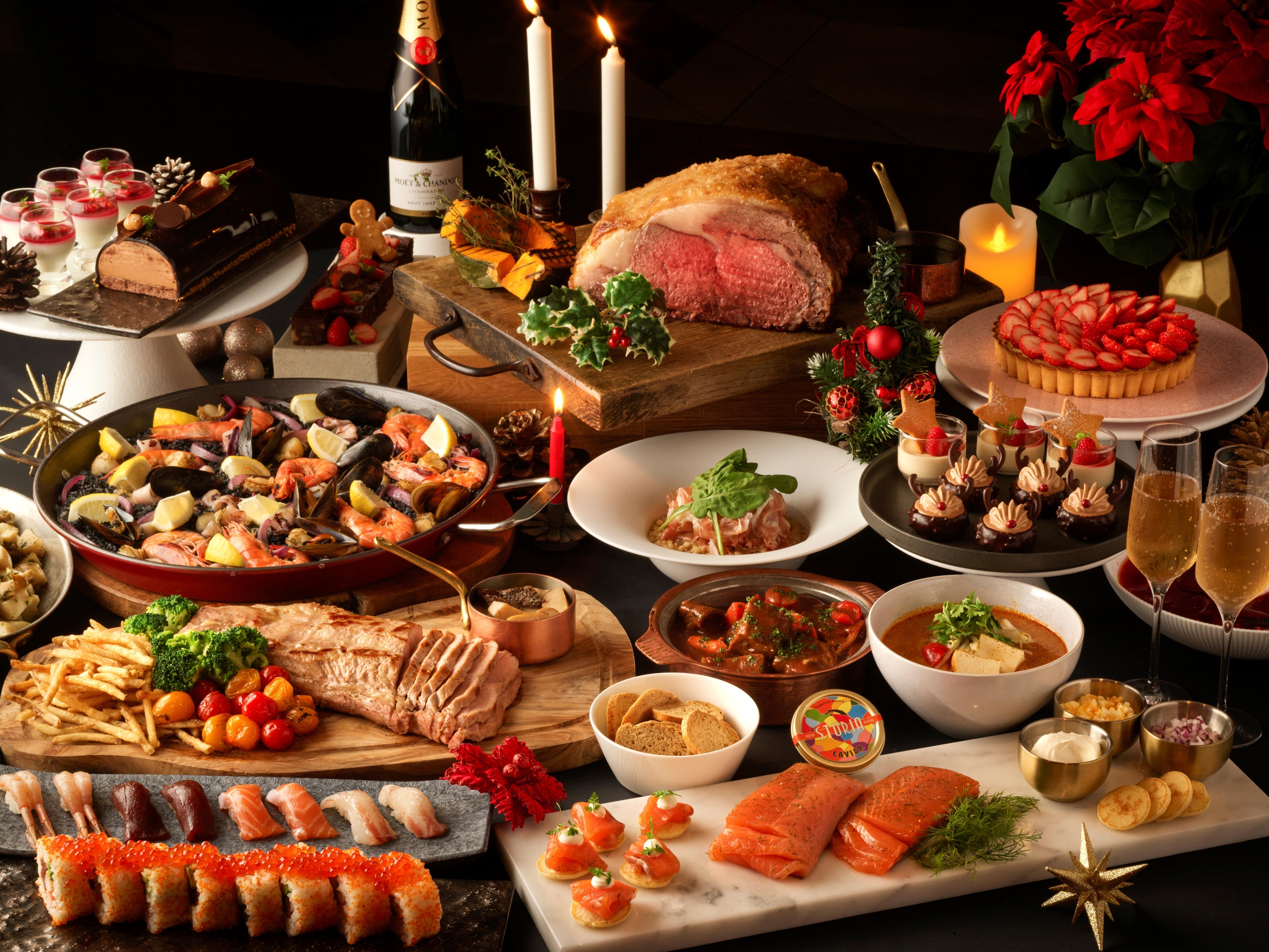 コンセプトである“美食の世界航海”にホリデーらしい特別感を添えた、心躍るビュッフェメニュー「クリスマス・ワールド・ボヤージュ」をご用意しました。北欧スタイルでマリネしたサーモンにキャビアを贅沢にあしらったグラブラックスサーモン、三崎港から届く魚介をふんだんに使ったイカ墨のパエリア、数種類のチーズをブレンドしたまろやかで深みのあるチーズフォンデュ、そしてイタリア産仔牛ロースのローストなど、思わずお皿に取りたくなる魅力的な料理が並びます。デザートには、スイス発のプレミアムブランド〈リンツ〉のチョコレートを使用したケーキをはじめ、多彩なスイーツがクリスマスを華やかに彩ります。