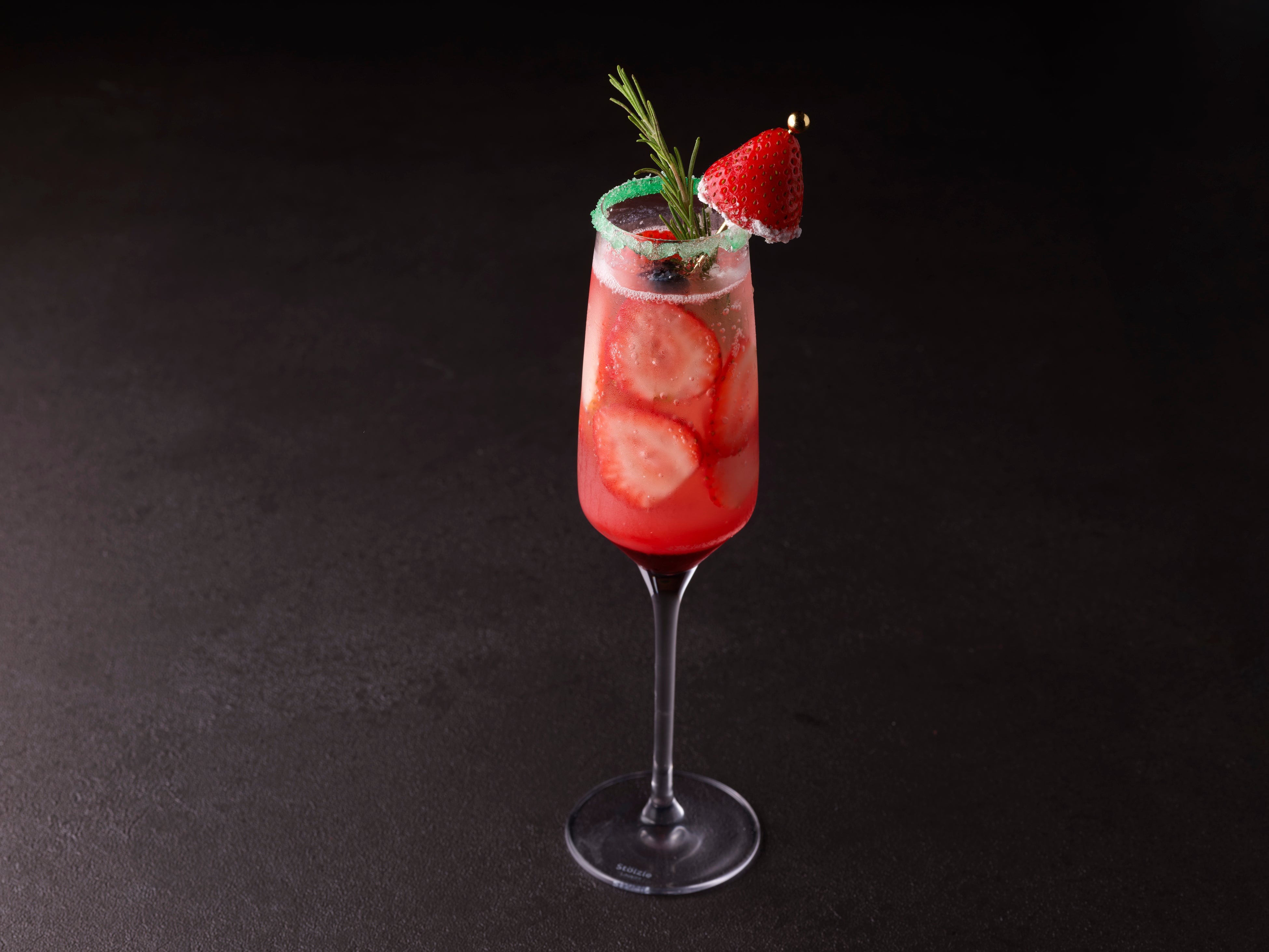また、同期間限定で、イチゴを使用したオリジナルカクテル「ノエル・ルージュ」もご提供。スパークリングワインに、モミの木をイメージしたローズマリーとイチゴで作った“サンタ帽”をあしらい、クリスマスムードをいっそう高めます。ノンアルコールのモクテルでもご用意しますので、アルコールが苦手な方やお子さまにもお楽しみいただけます。