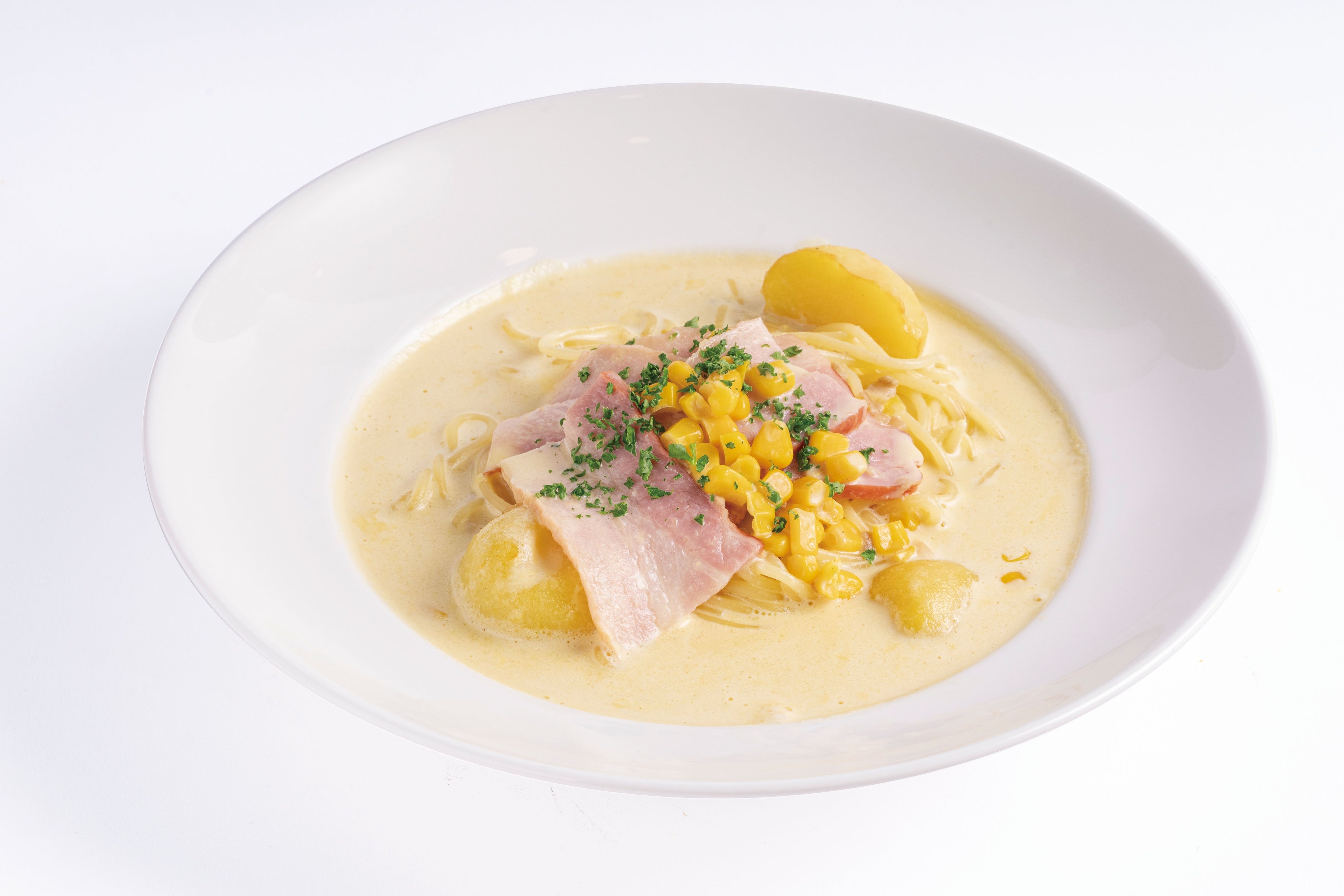 ポテトベーコン一丁目販売数NO1のコーンクリームのスープパスタ。素揚げしバターでコーティングしたじゃがいもにベーコンとたっぷりコーンが入った一丁目オリジナル。スープは最後まで飲み干してご満足いただけるよう絶妙な味加減に。