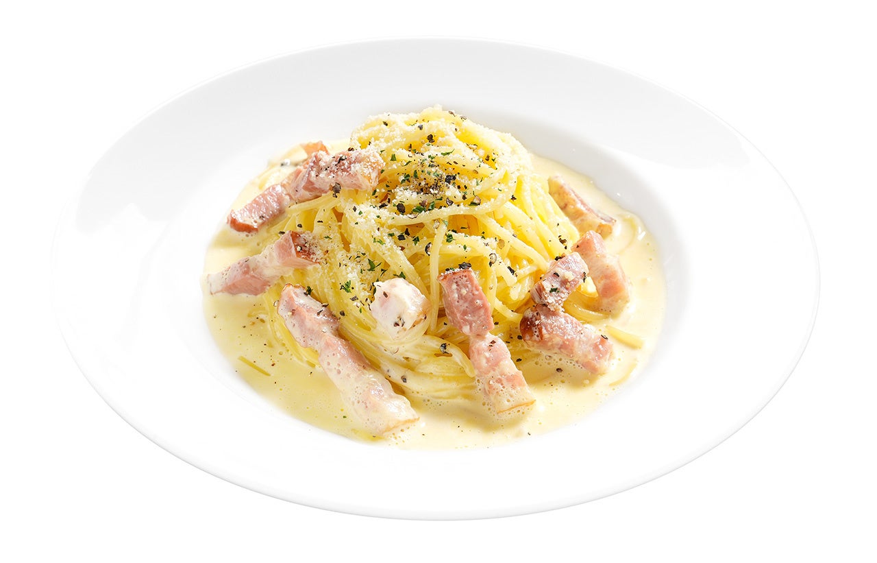 クリーミーカルボナーラ厚切りカットのベーコンに、北海道産生クリームを贅沢に使用した定番・人気の一皿。