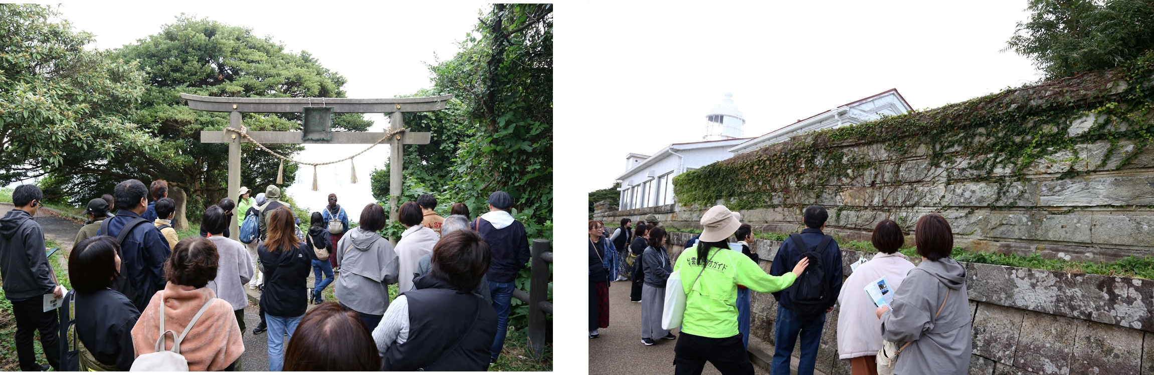 空も海もどんよりとした朝、ひんやりした空気の地蔵埼に、49人の参加者が集まりました。「美保関灯台が目覚める朝!岬の物語と灯台モーニング」は、美保関灯台と地蔵埼の魅力を発見するガイドツアーから始まりました。ツアーのガイドを務めるのは、出雲国ジオガイドの会のメンバーです。参加者は2組に分かれて、灯台周辺の見どころを巡りました。美保関灯台は歴史的文化財的価値の高い灯台であることや、地元の森山石が建設資材として使われていること、また地蔵埼は狭い場所に神話、自然、軍事、文学など幅広い魅力が詰まっていることについて解説を受けました。沖合4Kmにある島は、出雲神話に出てくるえびす様が鯛釣りをしていた場所と言い伝えられる事や、地蔵埼は「島根半島・宍道湖中海ジオパーク」のジオサイトに含まれ、大山隠岐国立公園にも指定されるなど自然の魅力にあふれていること、また与謝野鉄幹・晶子夫妻が美保関にも立ち寄り、歌を詠んだことなどについて、参加者は皆興味を持ってガイドに聞き入っていました。