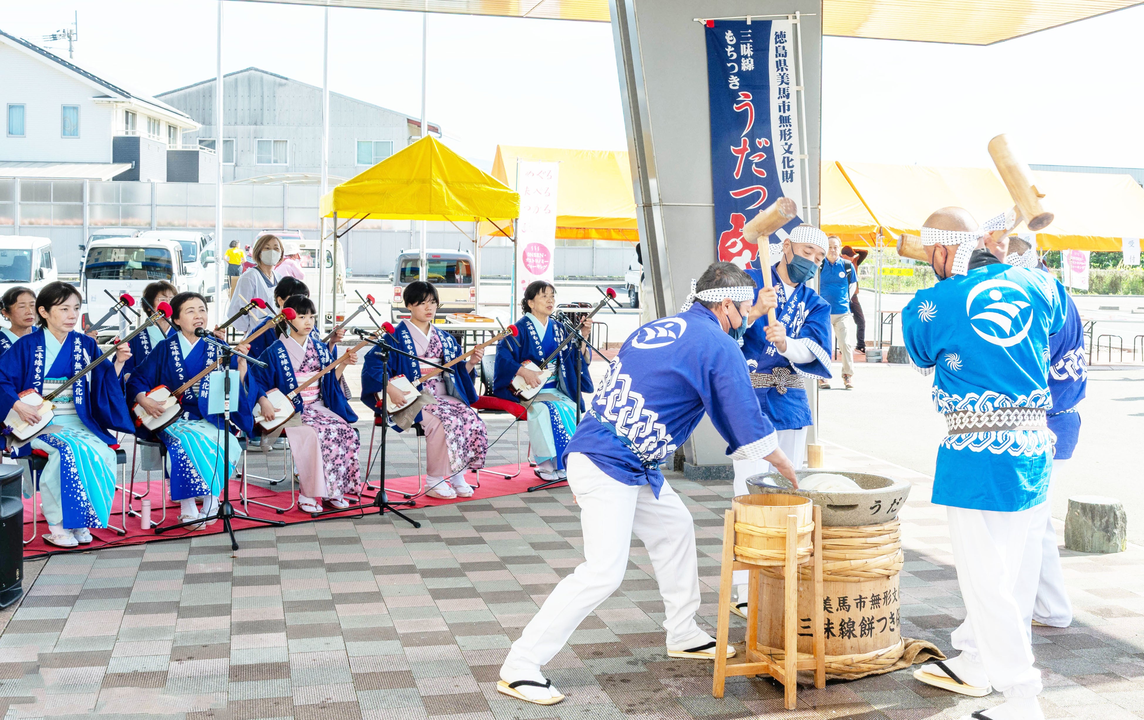 美馬市無形文化財である三味線餅つきも実施します。三味線や太鼓、歌に合わせて餅をつく、迫力ある伝統行事です。皆さまが一体となって楽しめる、地域ならではの人気イベントです。先着500名には、紅白餅を配布いたします。