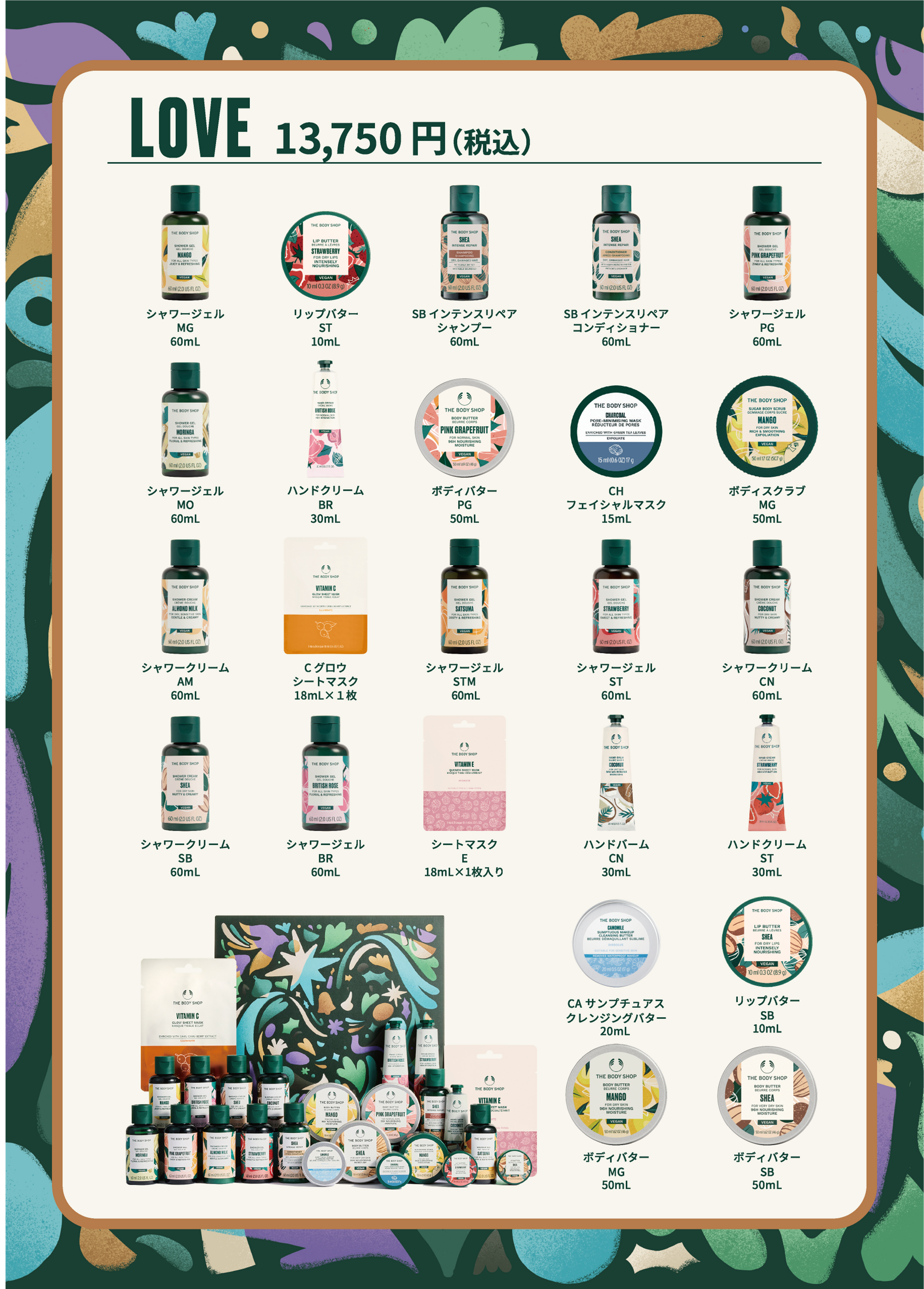 2025年のホリデーコレクションのテーマは「WRAPPED IN LOVE」です。ザボディショップの製品・ギフトは、パッケージから原材料の調達、製品の仕上げまで、携わるコミュニティへの愛とケア、地球への優しさ、あらゆる面で愛に包まれています。フルーツや花、平和の象徴の鳩やハートなど、さまざまなモチーフで構成されたアドベントとホリデーのパッケージデザインは、人と人とのつながり、ブランドパーパスである「使う方を応援し、社会を向上させる」という思いを表現したものです。