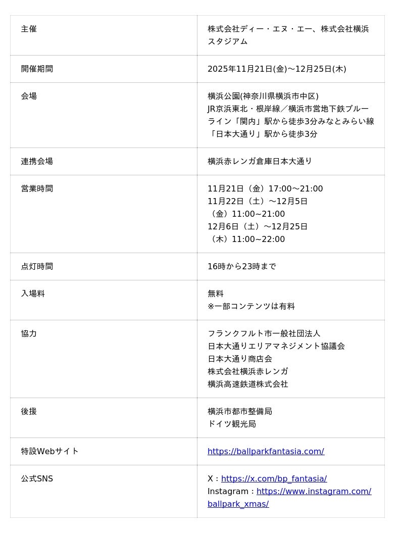 株式会社ディー・エヌ・エー(本社:東京都渋谷区、代表取締役社長兼CEO:岡村信悟、以下 DeNA)および株式会社横浜スタジアム(所在地:神奈川県横浜市、代表取締役社長:藤井 謙宗、以下 横浜スタジアム)は、2025年11月21日(金)から開催するクリスマスイベント「BALLPARK Xmas YOKOHAMA KANNAI 2025」について、横浜公園のエリアマップを公開しました。それぞれのエリアでお楽しみいただけるイルミネーション・グルメ・物販情報などの会場コンテンツや、周辺地域との連携施策についてお知らせします。