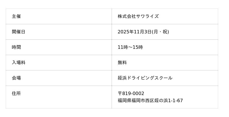 福岡市西区姪浜で街づくり、ものづくり、医療介護、教育、レジャー等のビジネスを展開する株式会社サワライズ(本社:福岡県福岡市西区、代表取締役:柴田 耕治)は、11月3日(祝)に「第20回 ふれ愛☆地域フェスタ」を開催します。
