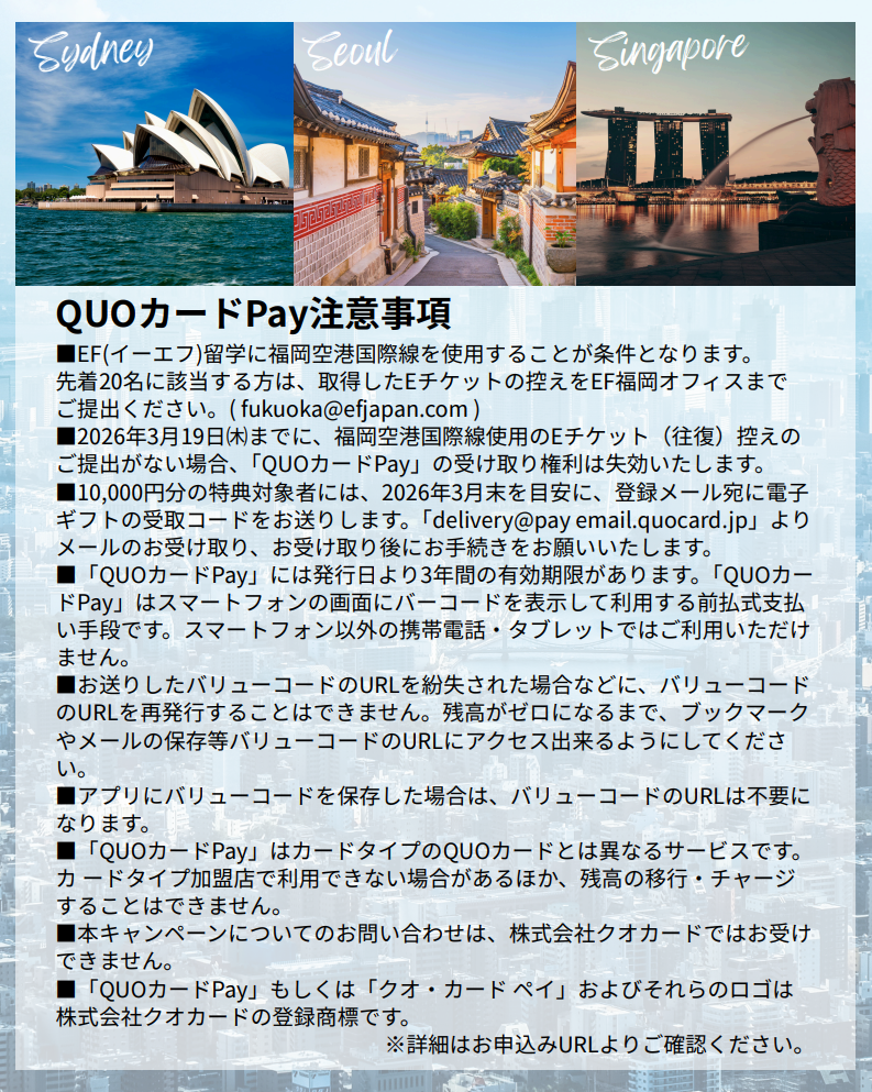 EF奨学金:留学費用最大10%(23,250円)の補助 QUOカードPay 10,000円分プレゼント