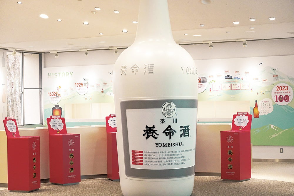 歴代養命酒ボトルデザインの変遷がわかるディスプレイも必見です。