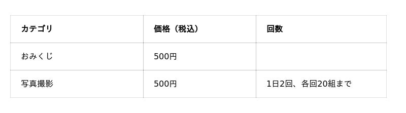 ※エサやり、記念撮影、縁日等は、別途料金が発生します。