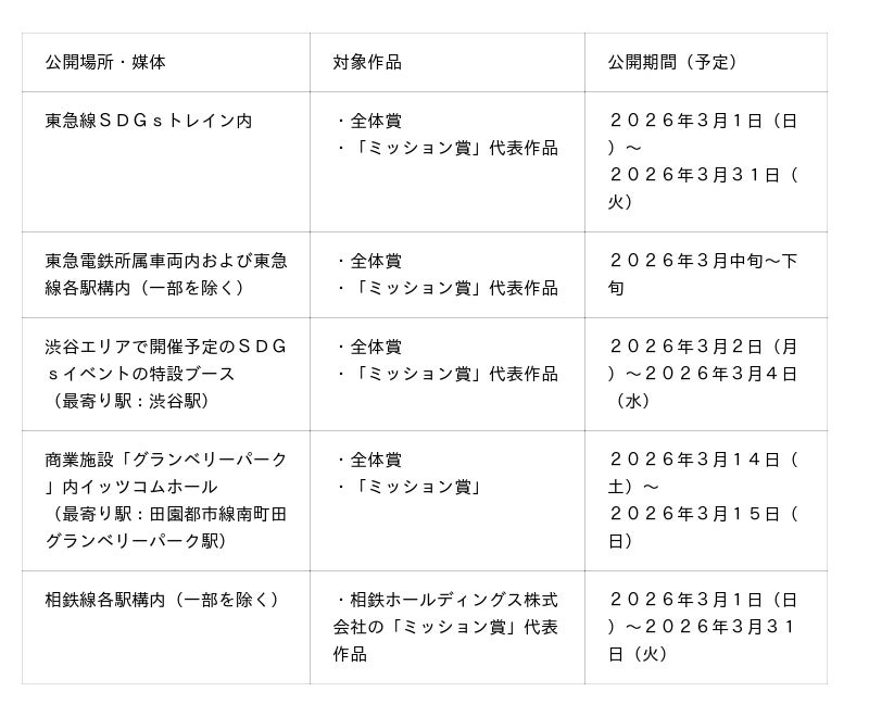 受賞作品は、特設サイトの他、東急線沿線をはじめとする交通広告や商業施設などで公開します。子どもたちのしなやかでフレッシュなアイデアから生まれる作品を広く公開することで、あらゆる世代の環境や社会にやさしい行動を促進するとともに、東急線沿線のさらなる魅力向上を目指します。