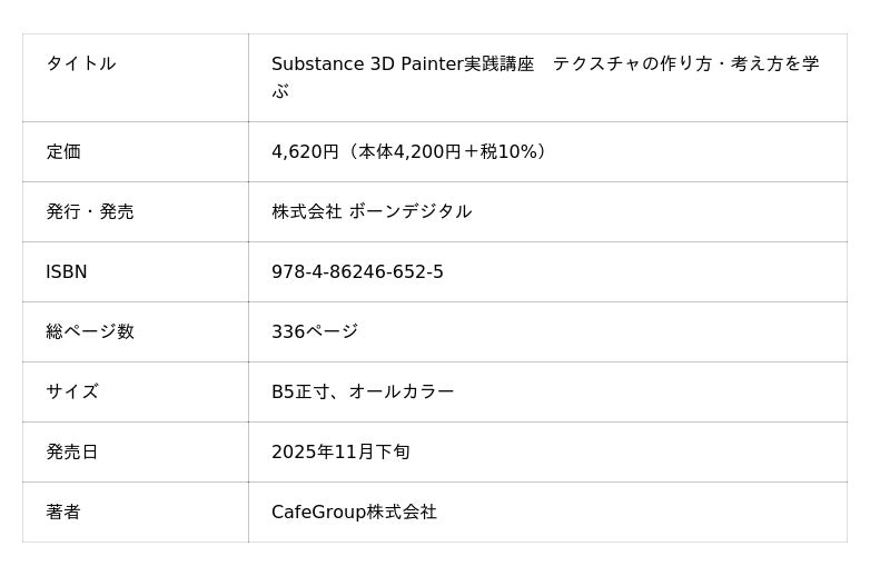 株式会社ボーンデジタル(本社:東京都千代田区、CEO:新 和也、URL:https://www.borndigital.co.jp)は、 『Substance 3D Painter実践講座 テクスチャの作り方・考え方を学ぶ』(著:CafeGroup株式会社)を2025年11月下旬に発売いたします。