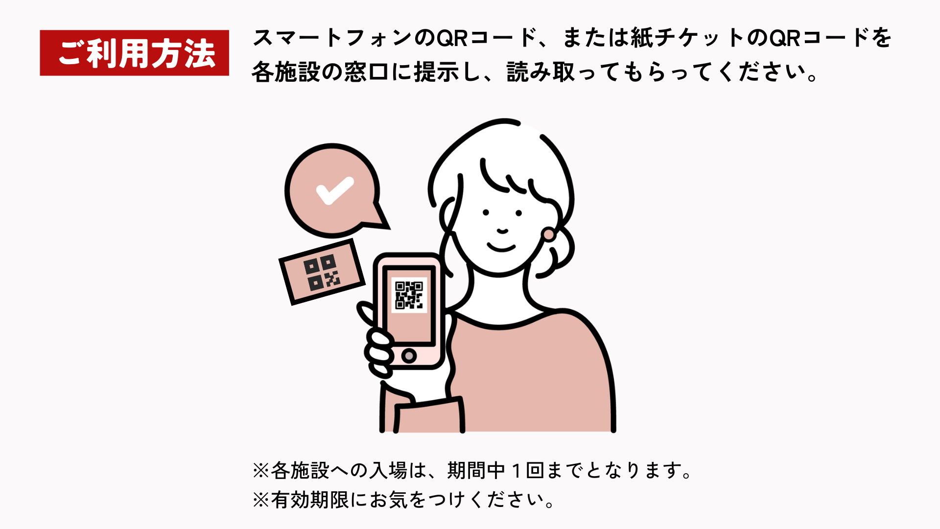 スマートフォンのQRコード、または紙チケットのQRコードを各施設の窓口に提示してください。