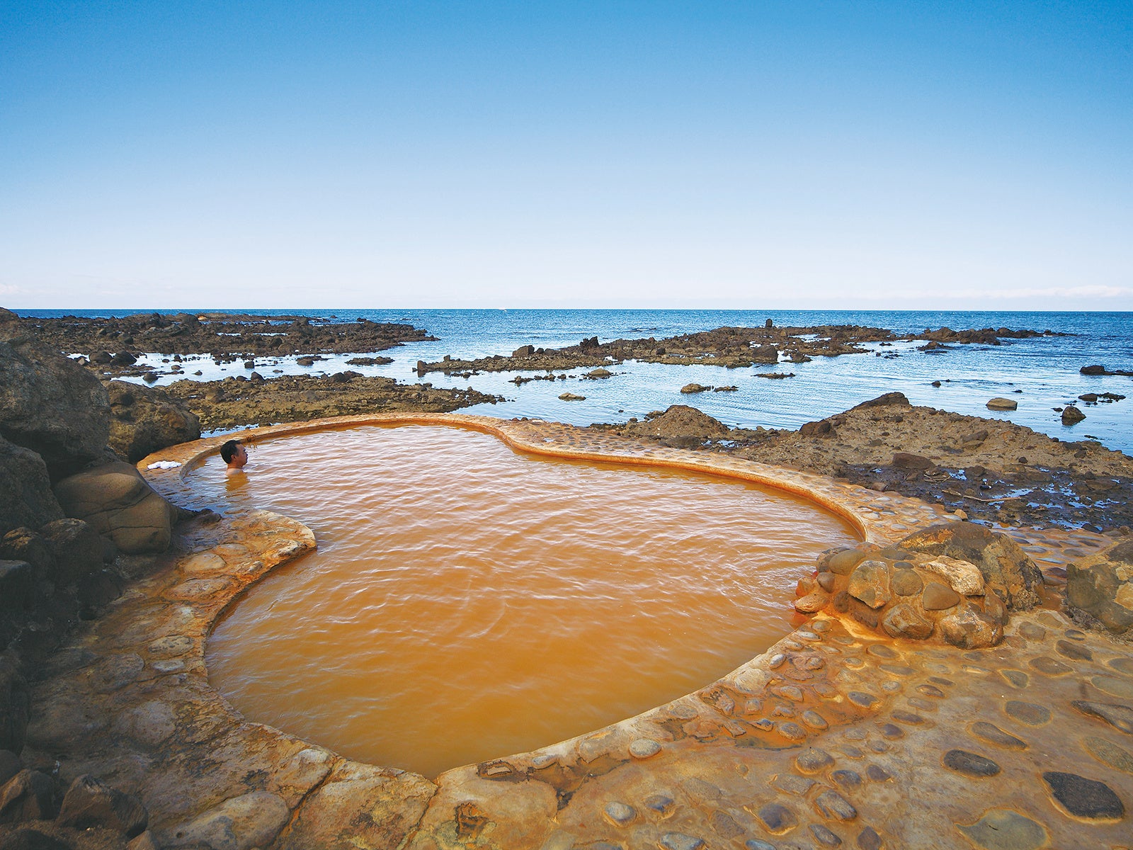 夕暮れ時には一面が黄金色に染まる「黄金崎」。日本海に沈む夕陽を望む、海までわずか1mの露天風呂が全国的にも有名な温泉です。