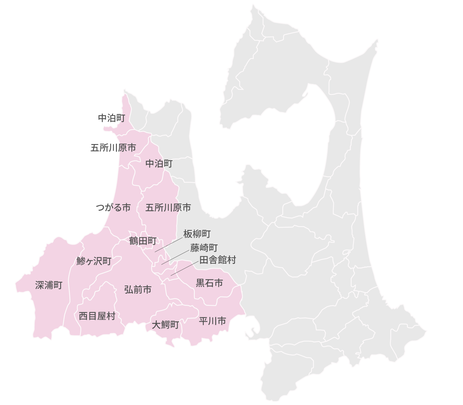 津軽圏域14市町村:弘前市、黒石市、五所川原市、つがる市、平川市、鰺ヶ沢町、深浦町、西目屋村、藤崎町、大鰐町、田舎館村、板柳町、鶴田町、中泊町