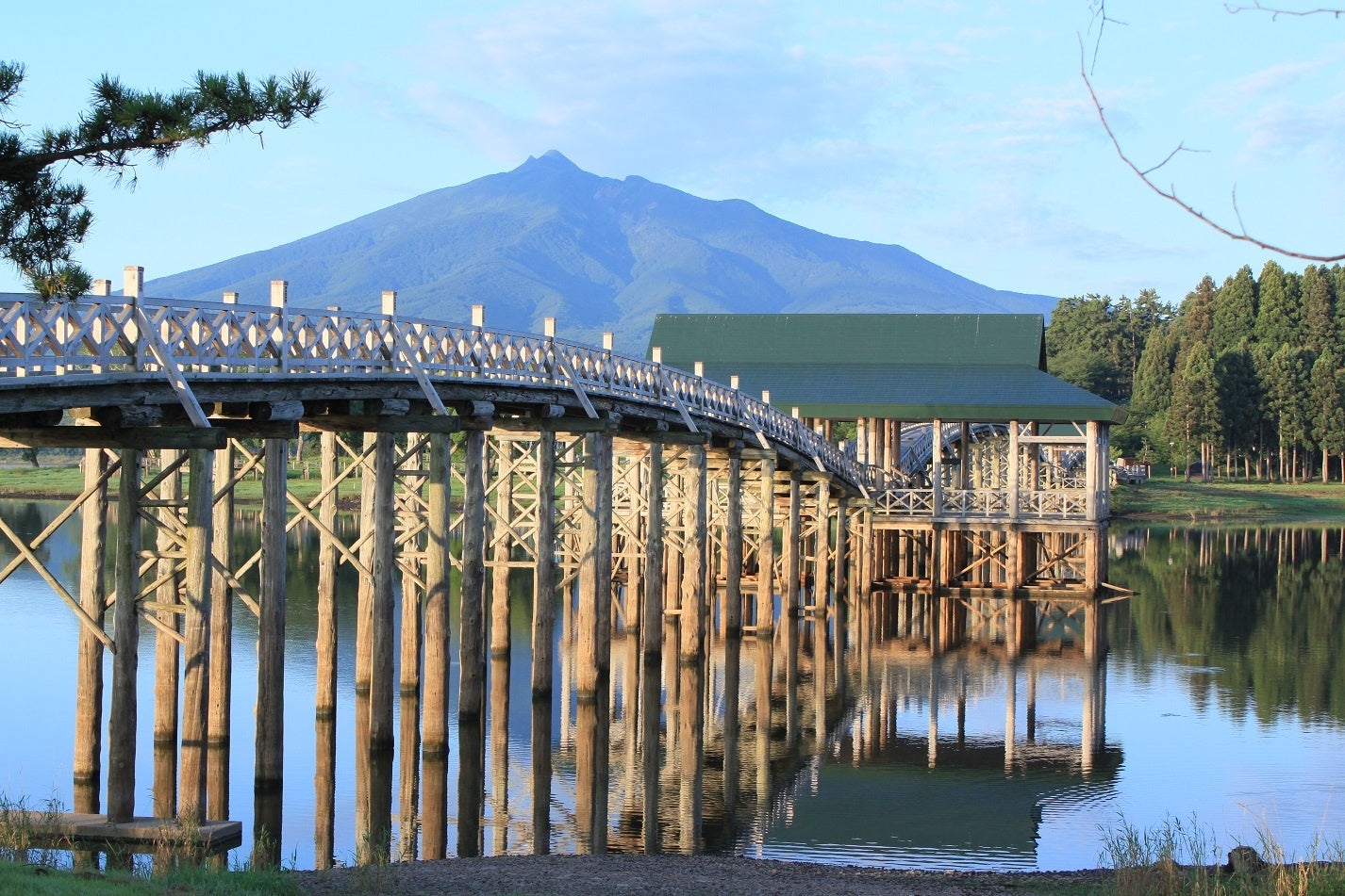 津軽富士見湖に架かる、日本一長い(全長300m)木造の三連太鼓橋。鶴が羽を広げたような優美な姿と、津軽富士・岩木山とのコントラストが絶景です。
