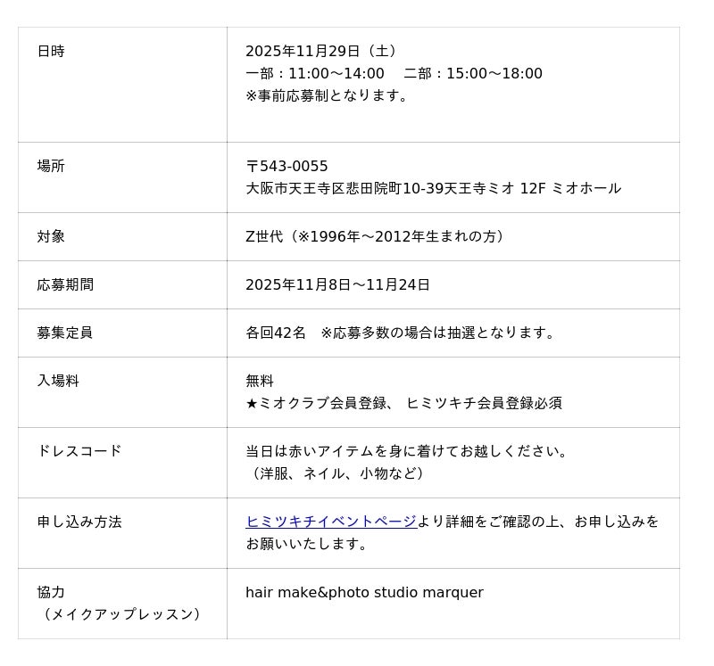 天王寺ミオのZ世代社員が運営する「ヒミツキチ」は、Z世代へ向けた大型イベント第5弾として、 『ヒミツキチ meet up 2025 - vol.5- ” EveryGreat Christmas starts with a little preparation.” ~素敵なクリスマスは、ちょっとした準備から始まる~』を開催します。
