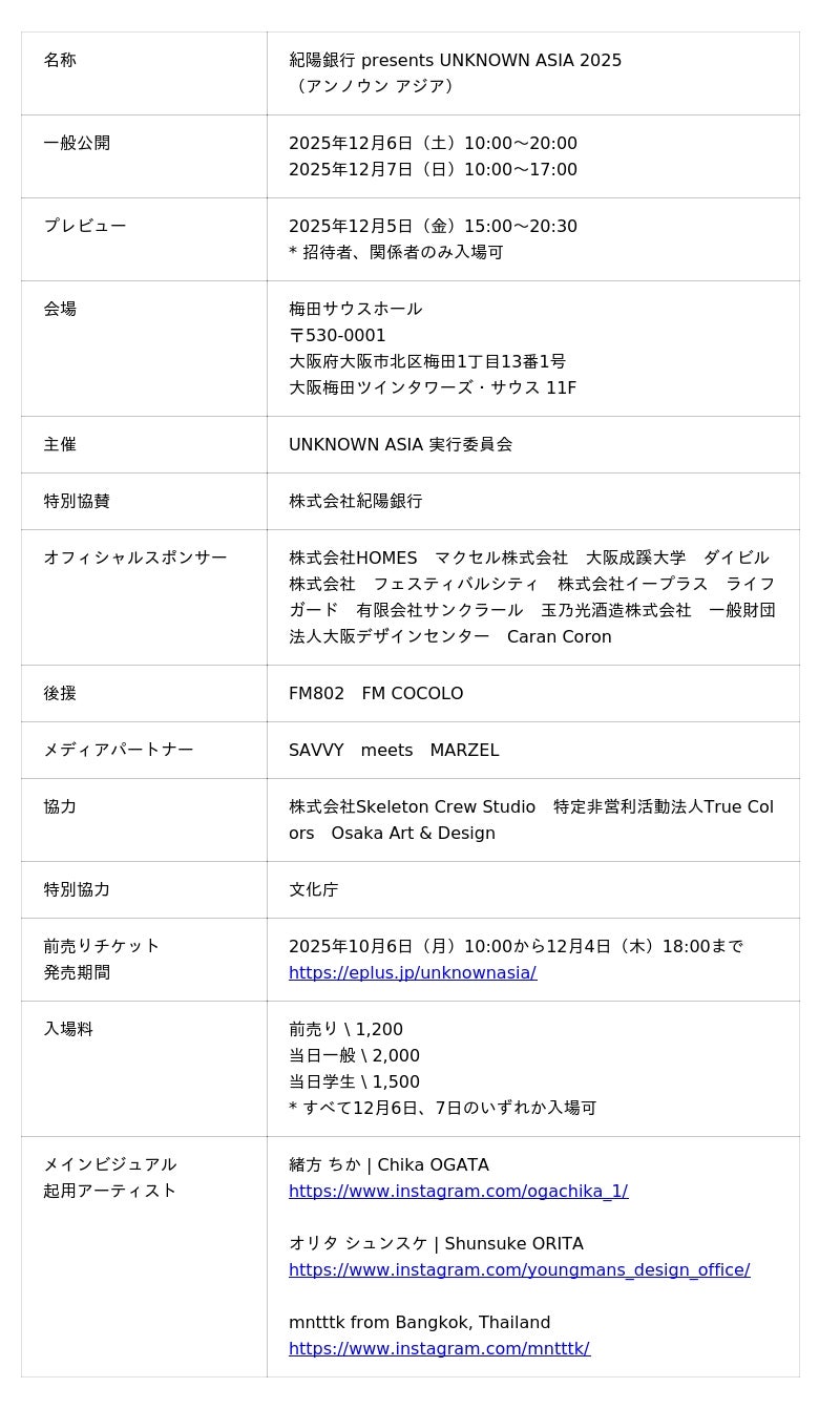UNKNOWN ASIA 実行委員会(大阪市北区)は、2025年12月5日(金)から12月7日(日)の3日間、梅田サウスホールにて開催(*)する国際的なアートフェア「紀陽銀行 presents UNKNOWN ASIA 2025」について、厳正なる審査を通過した国内外の出展アーティストを決定いたしました。