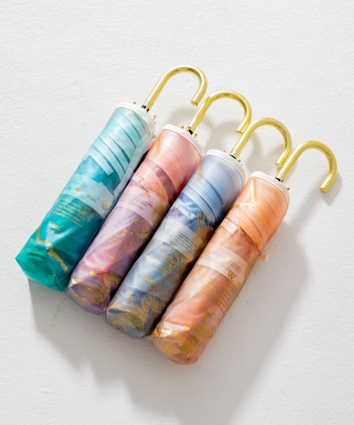 色の滲みや混じり合う模様を楽しむアルコールインクアートをイメージしたビニール傘。それぞれの色が無造作に重なり、ゆっくりと混ざり合う様子は穏やかな波を見ているよう。デザインのアクセントとなるゴールドプリントが華やかさをプラスします。