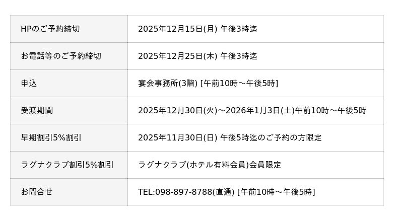 沖縄県宜野湾市のラグナガーデンホテル(株式会社 ラグナガーデンホテル)は料理長が心を込めて仕立てた「おせち」を販売いたします。三段重から特選重、少人数向けの二段重、大好評の洋食おせち風オードブルまで、多彩なラインナップをご用意しました。一年の節目を、ホテルならではの豪華食材と繊細な味わいをお楽しみください。