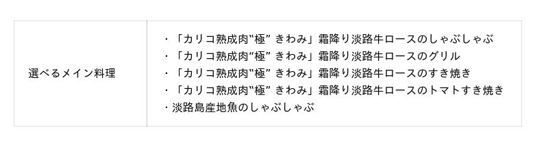 当リゾート自慢の自家熟成肉「カリコ熟成肉“極” きわみ」や、冬の高級食材「淡路島3年とらふぐ」など、旬の淡路島産食材を贅沢に使用。この時期だけの特別な味わいをお楽しみください。