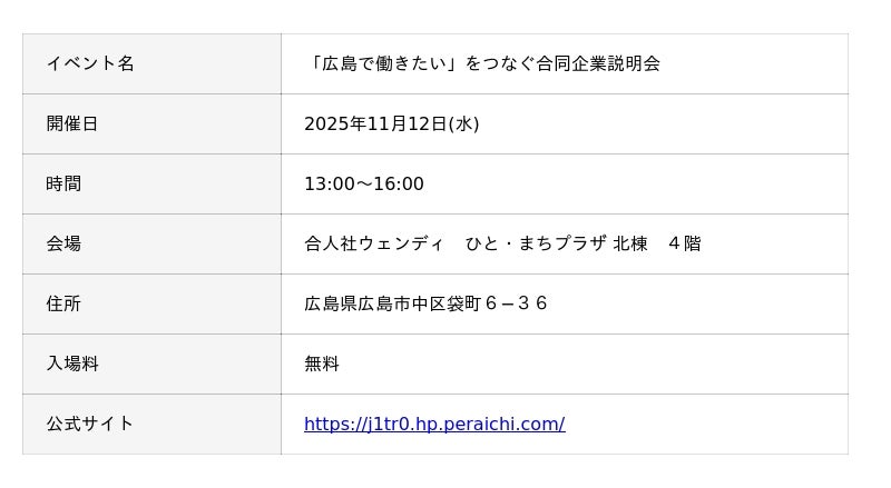 ソフトウェアを通して様々な情報サービス事業を展開する株式会社ジェイテック(以下「ジェイテック」)は、11月12日に合人社ウェンディで開催される「広島で働きたい」をつなぐ合同企業説明会にブースを出展いたします。