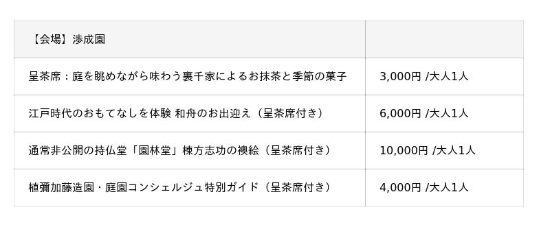 ※渉成園におけるプログラムチケットのみをご購入の場合は、渉成園ご入園の際に庭園維持寄付金として、大人700円/中高生300円がかかります。