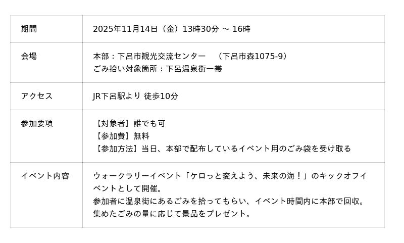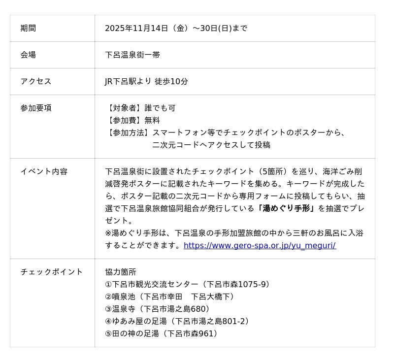また、初日の14日(金)には、キックオフイベントとして、「温泉街をめぐるごみ拾いイベント」を開催し、温泉街の中心を流れる飛騨川周辺のごみ拾いイベントも実施します。ウォークラリーイベントの告知をすると共に、海洋ごみ削減の啓発活動として行います。(協力:(一社)下呂温泉観光協会)